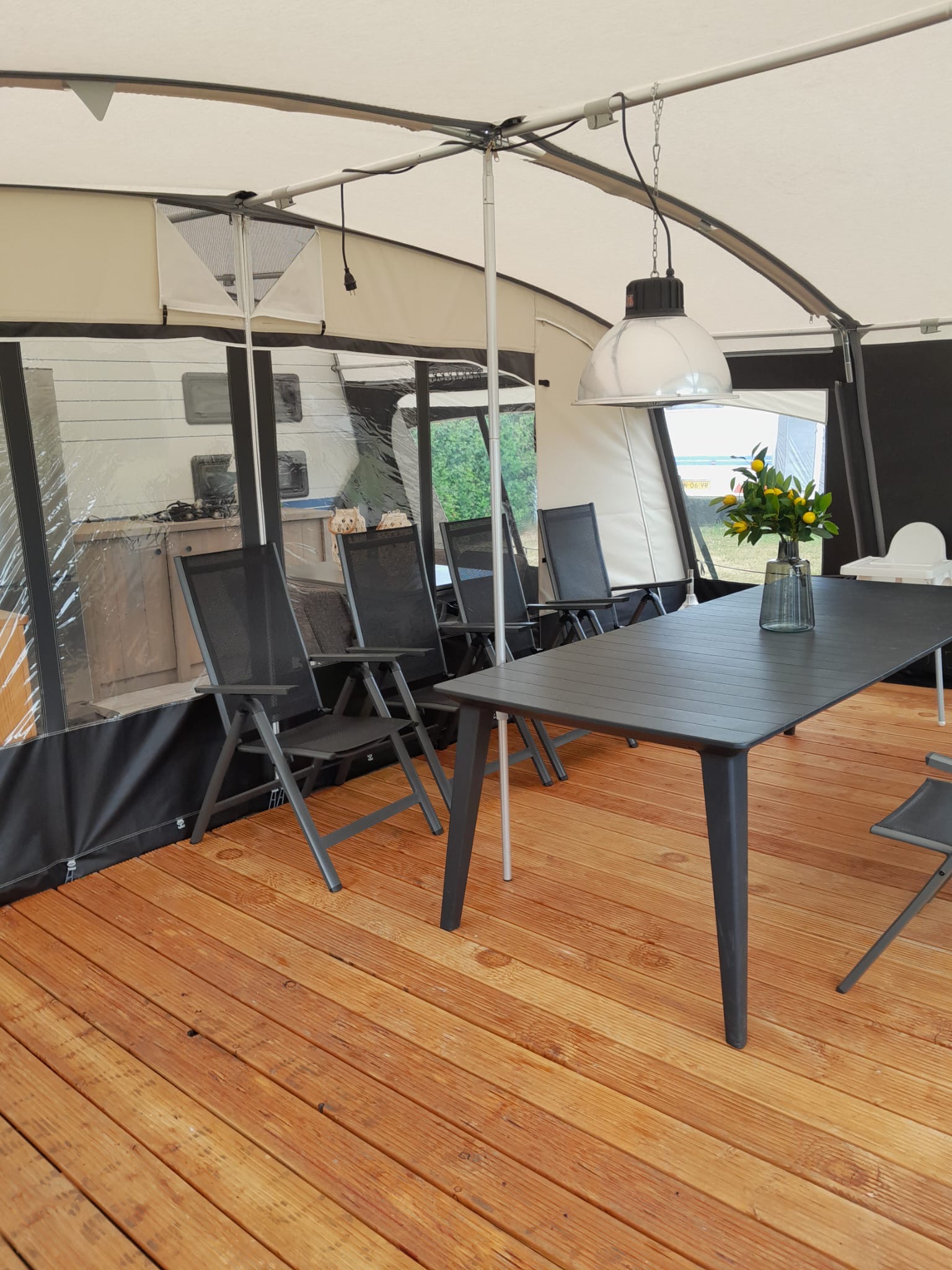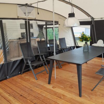 In de voortent ligt een houten vlonder met vinyl er overheen en onder de luifel ligt een hardhouten vlonder.voor extra slaapplaatsen kunt u er zelf een tent(je)naastzetten.