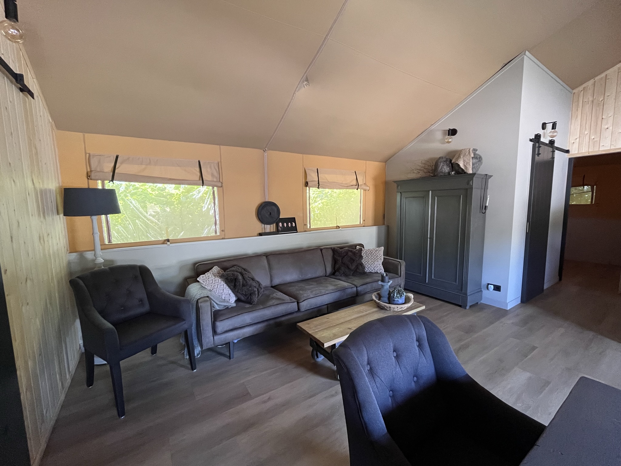 Deze tent is helemaal compleet ingericht zoals u thuis ook gewend bent, en voorzien van een pvc vloer.