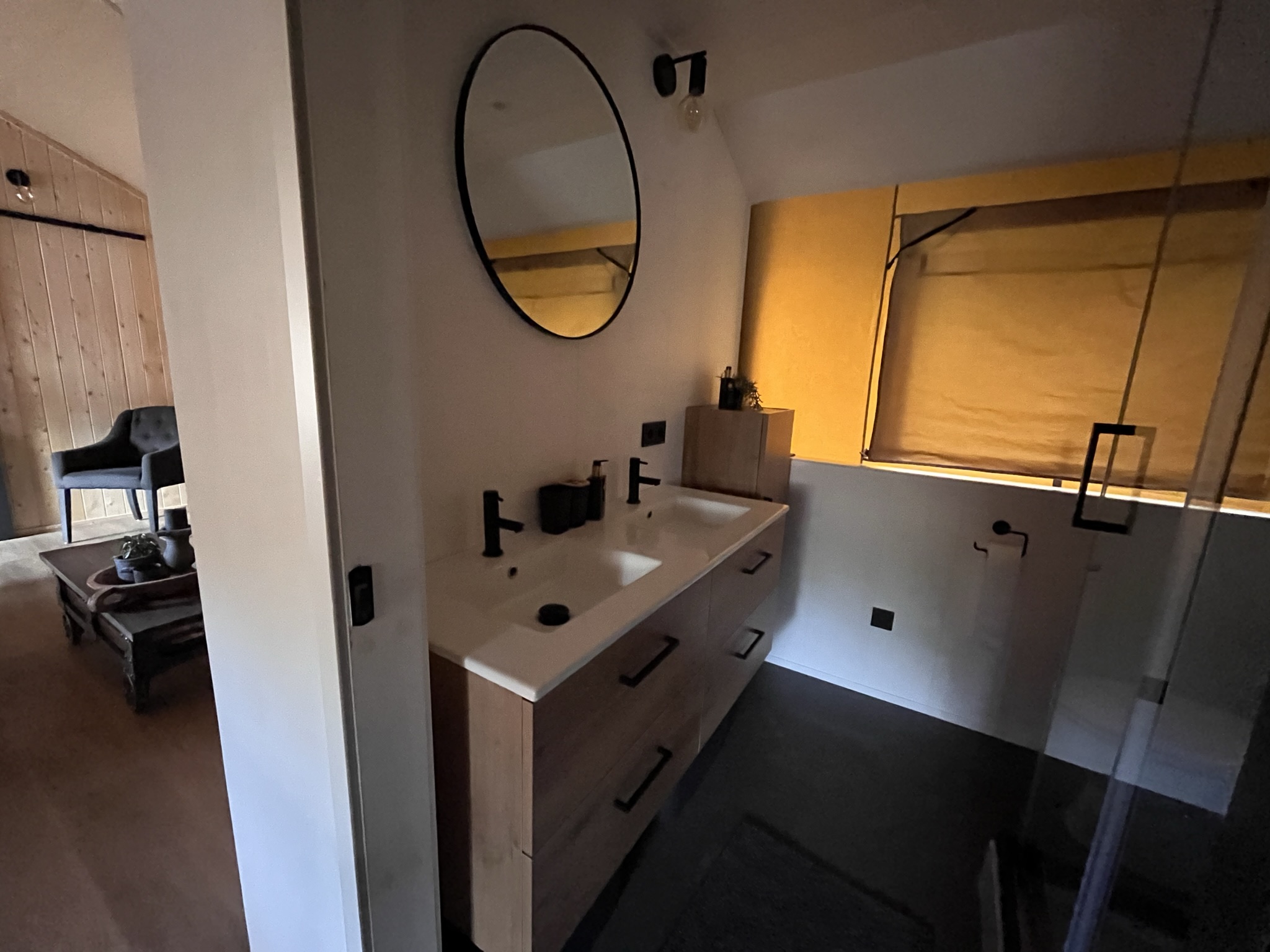 Badkamer: toilet, dubbele wastafel en douchecabine
