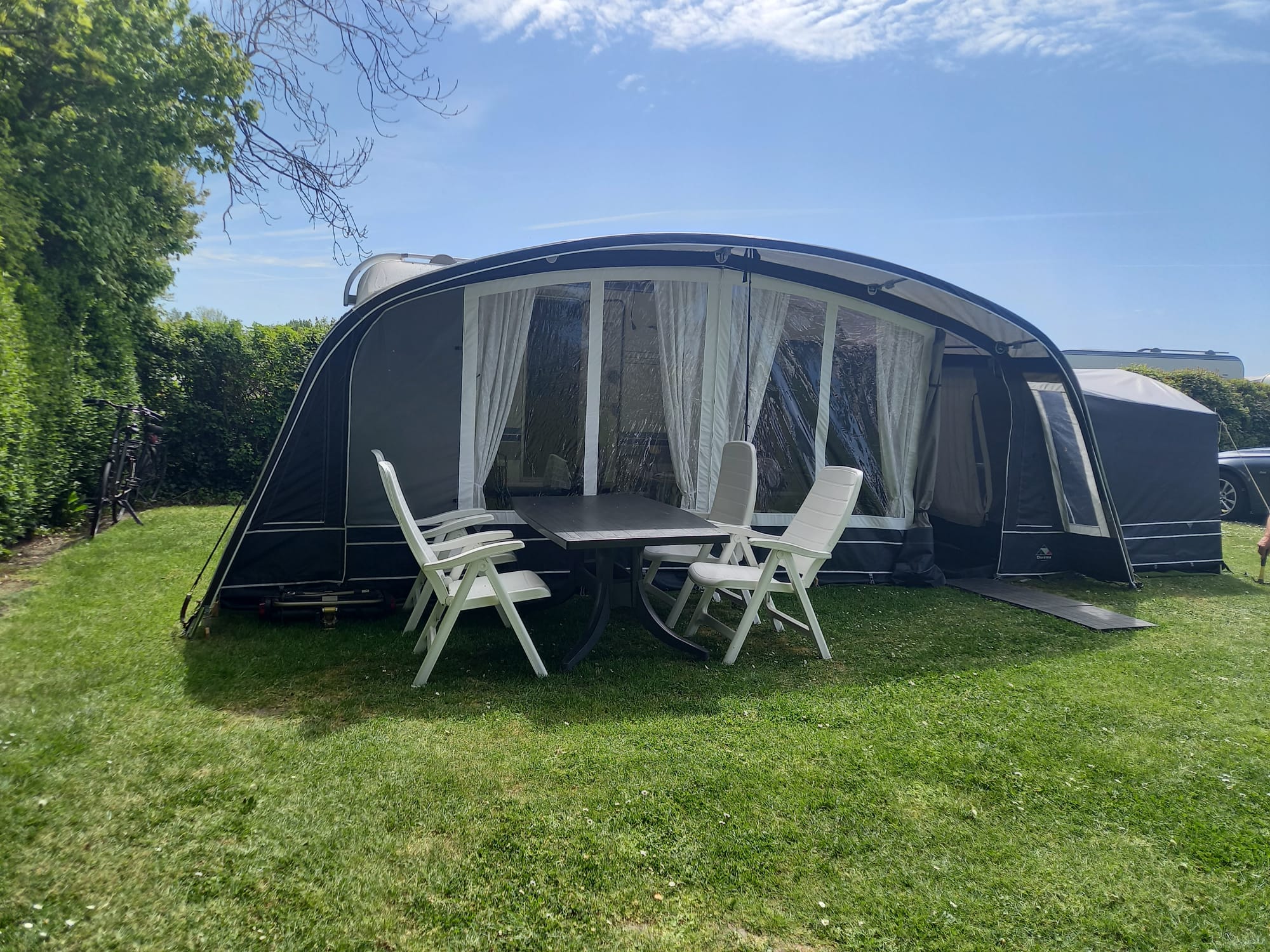 Onze caravan staat op een mooi centrale plek nabij toiletten, douches en speeltuin (vooraan de camping).